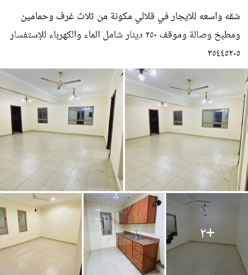 شقة واسعة للإيجار في قلالي، مكونة من ثلاث غرف وحمامين ومطبخ وصالة وموقف سيارة، بسعر 250 دينار شامل الماء والكهرباء