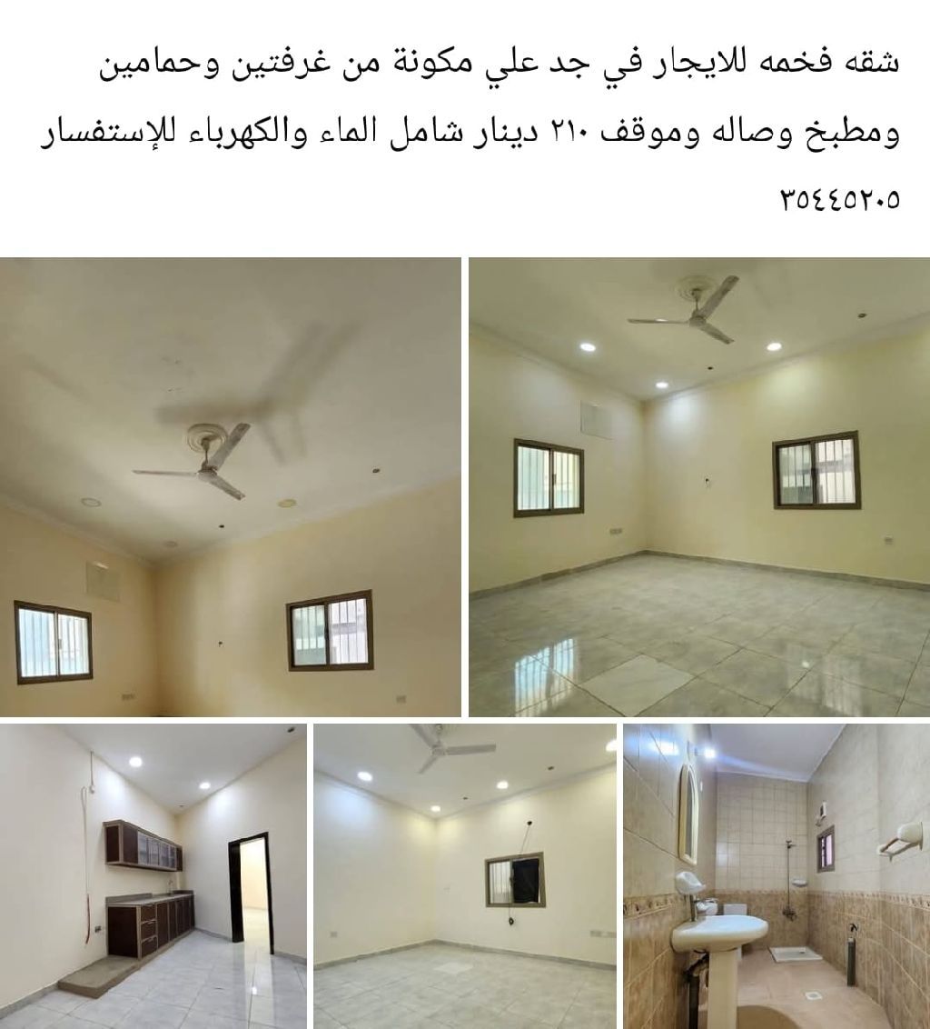 شقة فاخرة للإيجار في جد علي، تتكون من غرفتي نوم وحمامين ومطبخ وصالة وموقف للسيارات، بسعر 210 دينار شامل الماء والكهرباء