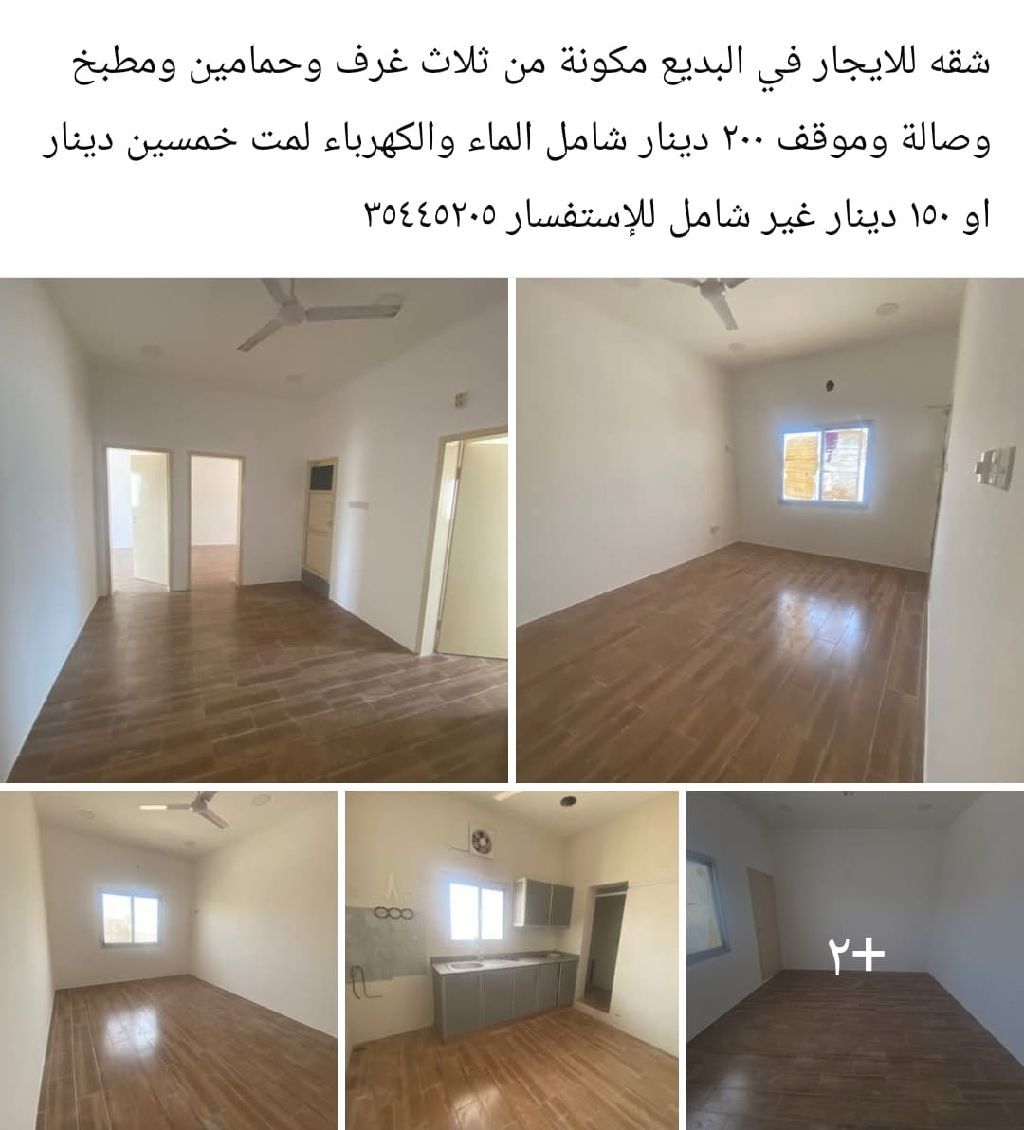 شقة للإيجار في البديع مكونة من ثلاث غرف وحمامين ومطبخ وصالة وموقف. 200 دينار شامل الماء والكهرباء، أو 150 دينار غير شامل.