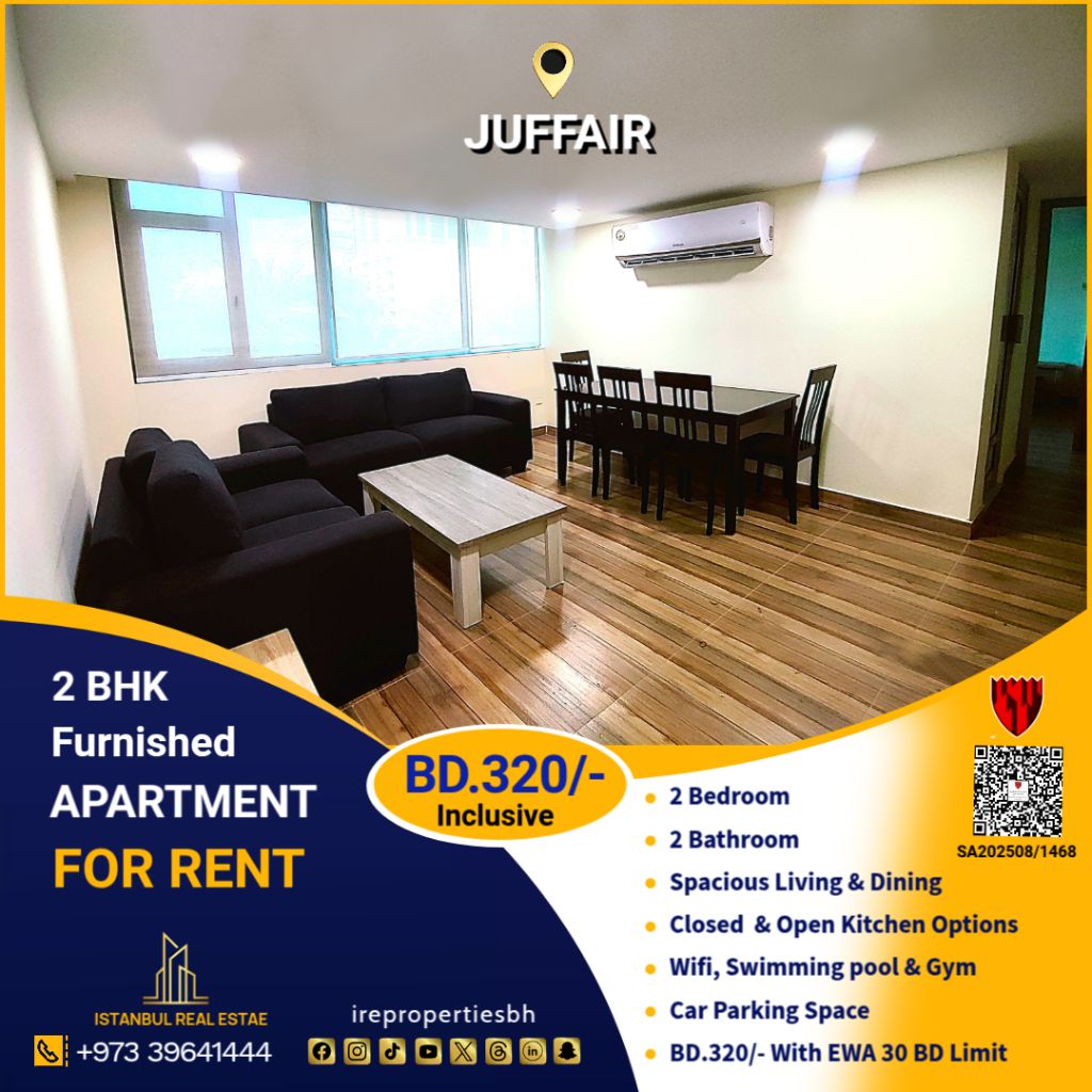 شقة مفروشة 2 غرف نوم للإيجار في الجفير بسعر 320 دينار بحريني مع بدل سكن. تقع هذه الشقة في الجفير بالقرب من واحة مول. تتكون من غرفتي نوم، حمامين، منطقة معيشة وطعام واسعة، خيار مطبخ مغلق أو مفتوح، واي فاي، حمام سباحة، صالة ألعاب رياضية، موقف سيارات مغطى، وأمن على مدار 24 ساعة. سهولة الوصول الى جفير مول، واحة مول، العدلية، المنامة، المحرق، الحورة، القضيبية، وغيرها. الإيجار 320 دينار بحريني مع بدل سكن