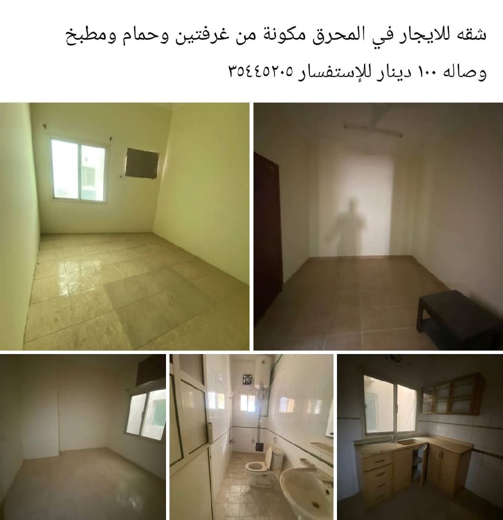 شقة للإيجار في المحرق مكونة من غرفتين وحمام ومطبخ وصالة بسعر 100 دينار