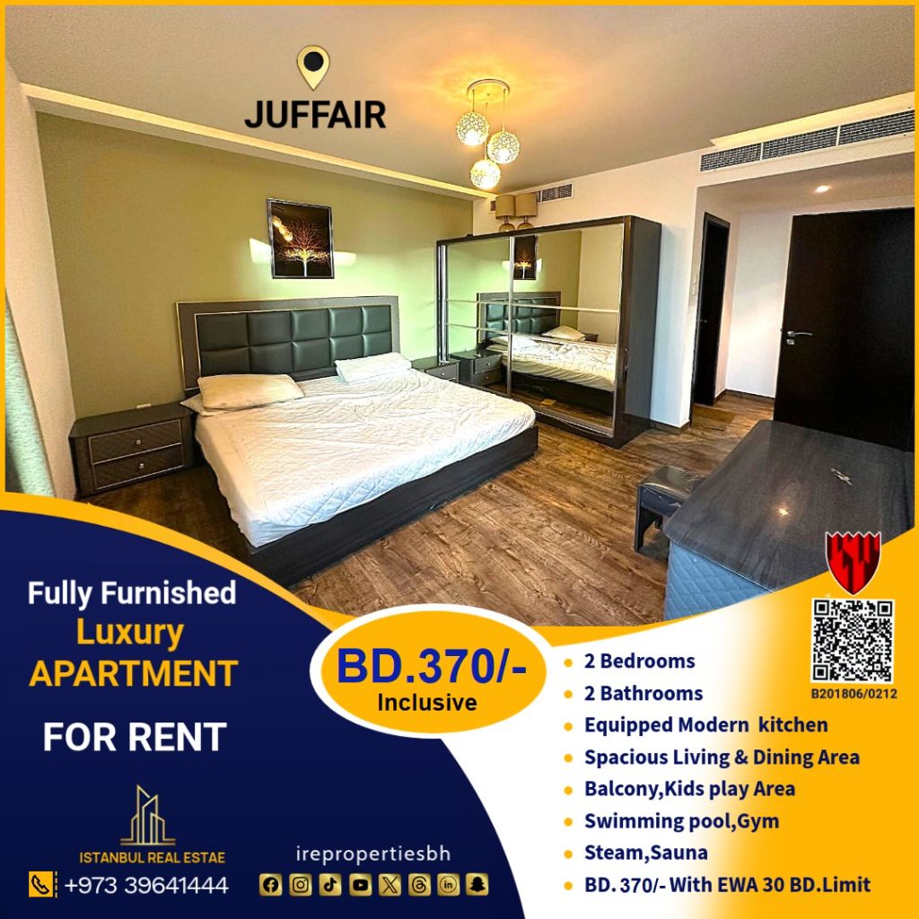 شقة فاخرة مفروشة بالكامل للإيجار في الجفير بسعر 370 دينار بحريني شهرياً، تشمل الكهرباء والماء. تقع هذه الشقة الفاخرة المكونة من غرفتي نوم في الجفير، وتحتوي على غرفتي نوم، حمامين، مطبخ مجهز، مصعد، موقف سيارات، حمام سباحة، صالة ألعاب رياضية، بخار، ساونا، منطقة ألعاب، أمن على مدار 24 ساعة، وغير ذلك. تتميز بغرفة معيشة أنيقة ومنطقة لتناول الطعام للاستمتاع بوقت جميل مع عائلتك. يسهل الوصول منها إلى مجمع الجفير، المستشفى التخصصي، مجمع الواحة، والعدلية.