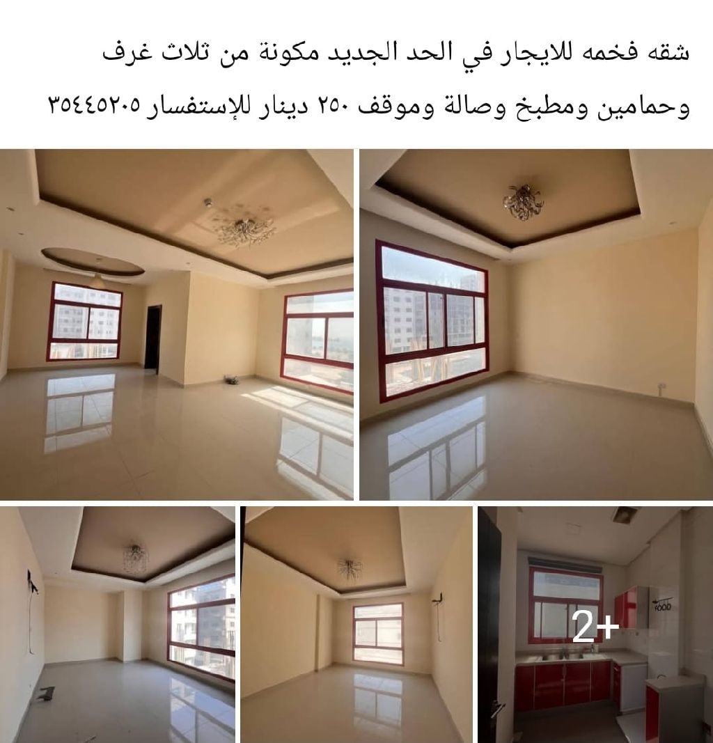 شقة فخمة للإيجار في الحد الجديد، مكونة من ثلاث غرف وحمامين ومطبخ وصالة وموقف مقابل 250 دينار