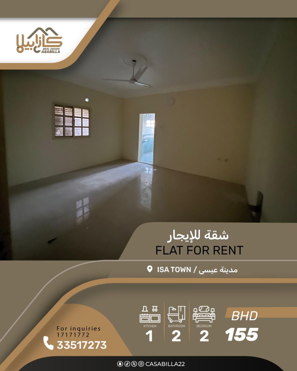 للإيجار: شقق في مدينة عيسى، بالقرب من المركز الصحي والمدارس الحكومية. تتكون من غرفتي نوم، إحداهما غرفة نوم رئيسية، وصالة، وحمامين، ومطبخ. يوجد موقف سيارات مظلل. السعر 155 دينار بحريني، غير شامل الكهرباء. للاستفسار.
