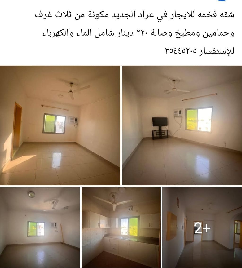 شقة فخمة للإيجار في عراد الجديد، مكونة من ثلاث غرف وحمامين ومطبخ وصالة، بسعر 220 دينار شامل الماء والكهرباء