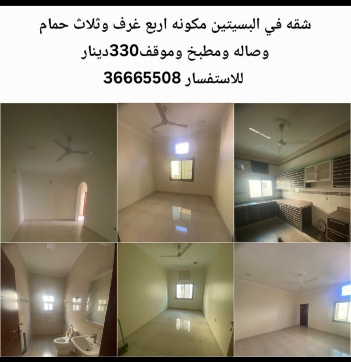 شقة للإيجار في البسيتين مكونة من أربع غرف وثلاث حمامات وصالة ومطبخ وموقف بسعر 330 دينار.