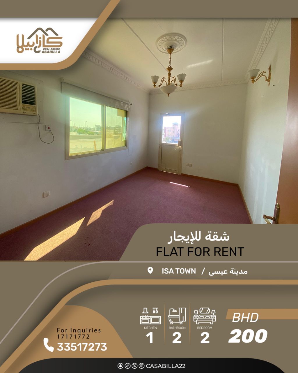 شقة في مدينة عيسى بالكامل، الدور الثاني، يوجد مصعد ومكيفات. تشطيب ممتاز، قريبة من السوق الشعبي ورامز. مناسبة للسكن العائلي في حي هادئ، قريبة من الخدمات الحيوية (مسجد، سوبر ماركت، مدارس، مجمعات تجارية، منتزه، إلخ). تتكون الشقة من 2 غرف نوم، 1 غرفة ماستر، 2 حمام، صالة واسعة، ومطبخ. موقف للسيارة مظلل. الإيجار 200 دينار غير شامل الكهرباء والماء. للتواصل.
