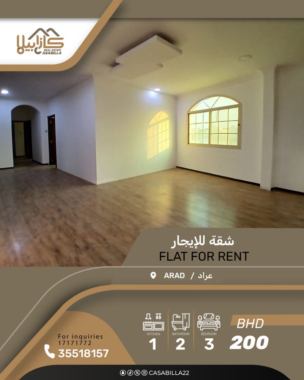 للإيجار: شقة جميلة في منطقة عراد، حي هادئ وراقٍ. تتكون من 3 غرف نوم، حمامين، صالة عائلية، ومطبخ مفتوح. المطبخ مجهز. السعر 200 دينار، غير شامل الكهرباء. للاستفسار.