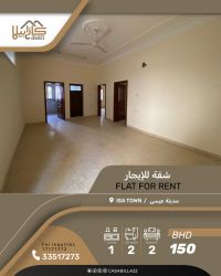 للإيجار: شقة في مدينة عيسى قريبة من السوق الشعبي ورامز، مناسبة للسكن العائلي في حي هادئ. وهي قريبة من الخدمات الحيوية (مسجد، سوبر ماركت، مدارس، مجمعات تجارية، منتزه، إلخ). تتكون الشقة من غرفتي نوم، وحمامين، وصالة واسعة، ومطبخ مغلق. يوجد موقف للسيارة. الإيجار 150 دينار غير شامل للكهرباء والماء. للتواصل.
