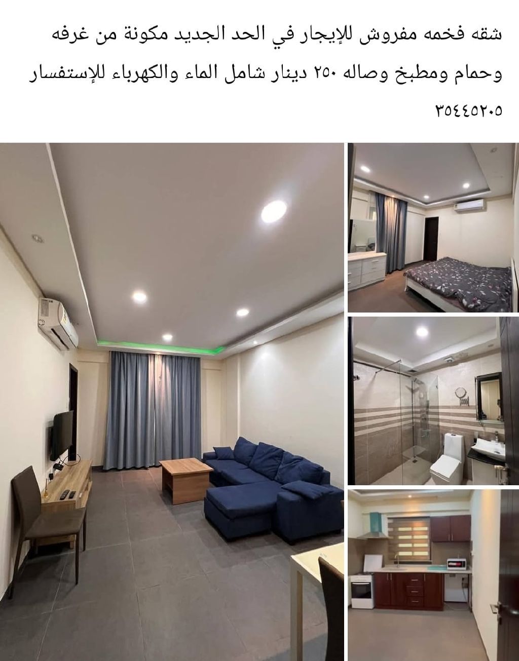شقة فاخرة مفروشة للإيجار في الحد الجديد، مكونة من غرفة نوم واحدة ومطبخ وحمام وصالة، بسعر 250 ديناراً تشمل الماء والكهرباء.