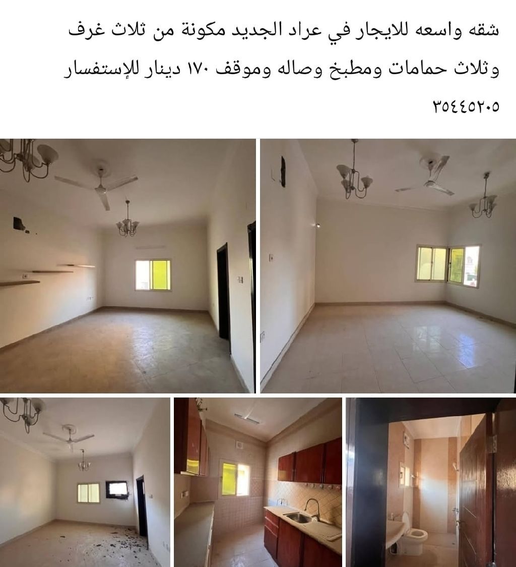 شقة واسعة للإيجار في عراد الجديد، مكونة من ثلاث غرف نوم وثلاثة حمامات ومطبخ وصالة وموقف سيارات بسعر 170 دينار.