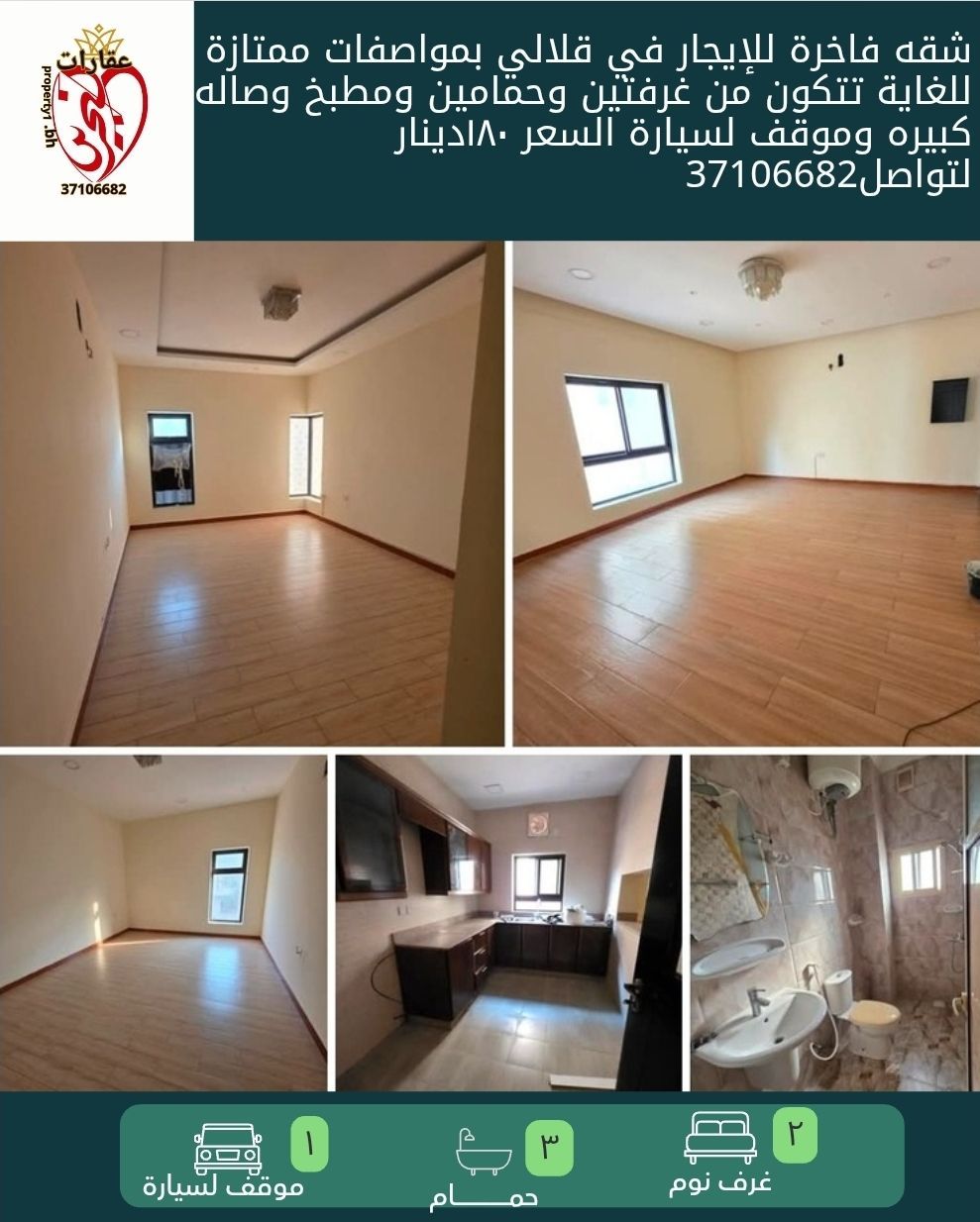 شقة فاخرة للإيجار في قلالي بمواصفات ممتازة للغاية، تتكون من غرفتين وحمامين ومطبخ وصالة كبيرة وموقف لسيارة. السعر 180 دينار. للتواصل