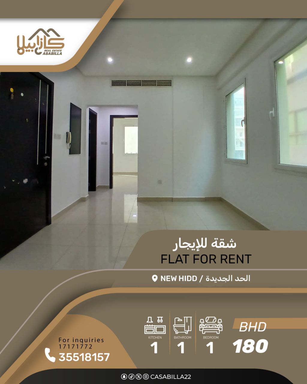 للإيجار: شقة في منطقة الحد الجديدة تتكون من غرفة نوم، صالة، مطبخ، حمام، تكييف مركزي، مصعد، ومواقف سيارات. السعر 180 دينار شامل الكهرباء مع حد استهلاك 30 دينار. للاستفسار.