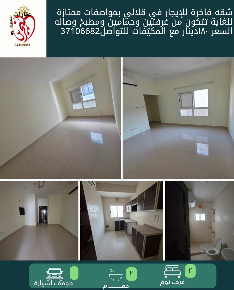 شقة فاخرة للإيجار في قلالي بمواصفات ممتازة للغاية، تتكون من غرفتين وحمامين ومطبخ وصالة. السعر 180 دينار مع المكيفات. للتواصل