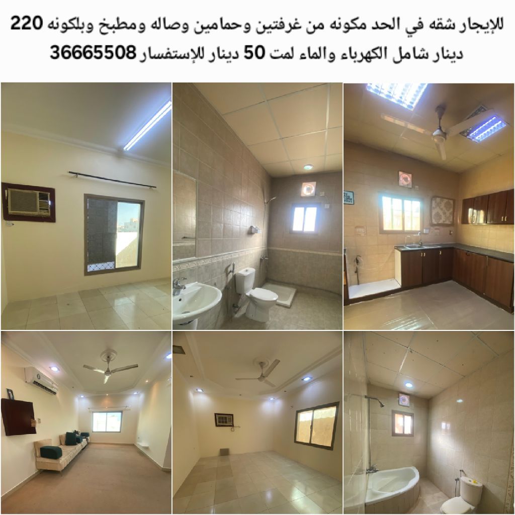 للإيجار شقة في الحد مكونة من غرفتين وحمامين وصالة ومطبخ وبلكونة بسعر 220 دينار، تشمل الكهرباء والماء حتى حد 50 دينار.