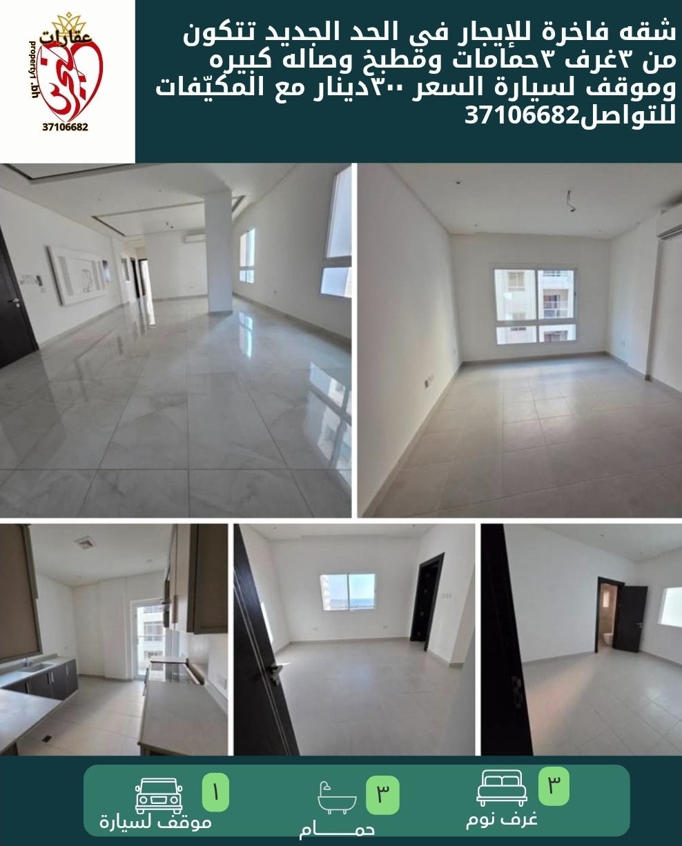 شقة فاخرة للإيجار في الحد الجديد، تتكون من 3 غرف، 3 حمامات، مطبخ، صالة كبيرة، وموقف سيارة. السعر 300 دينار مع المكيفات. للتواصل