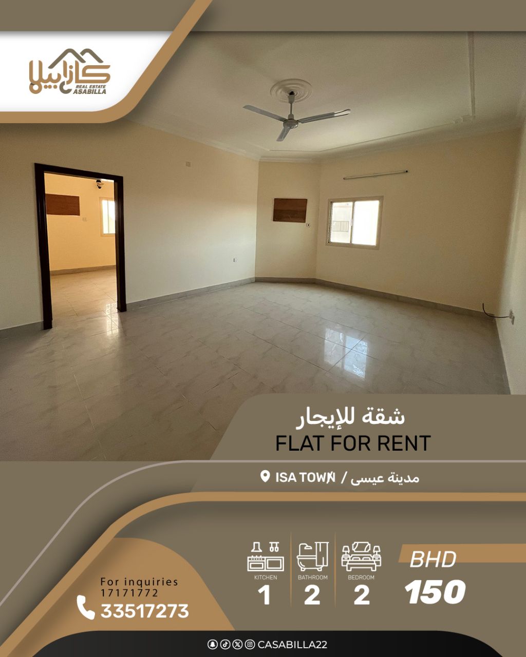 للإيجار: شقة في مدينة عيسى، خلف شارع العبايات. أولاً، تفاصيل الشقة: غرفة نوم رئيسية واحدة، حمام واحد، صالة عائلية واحدة، مطبخ واحد. ثانياً، المرافق والخدمات: موقف سيارات مظلل، قريبة من الخدمات وشارع جد علي. الإيجار 150 دينار بحريني، غير شامل الكهرباء والماء. للمزيد من المعلومات، يرجى الاتصال.