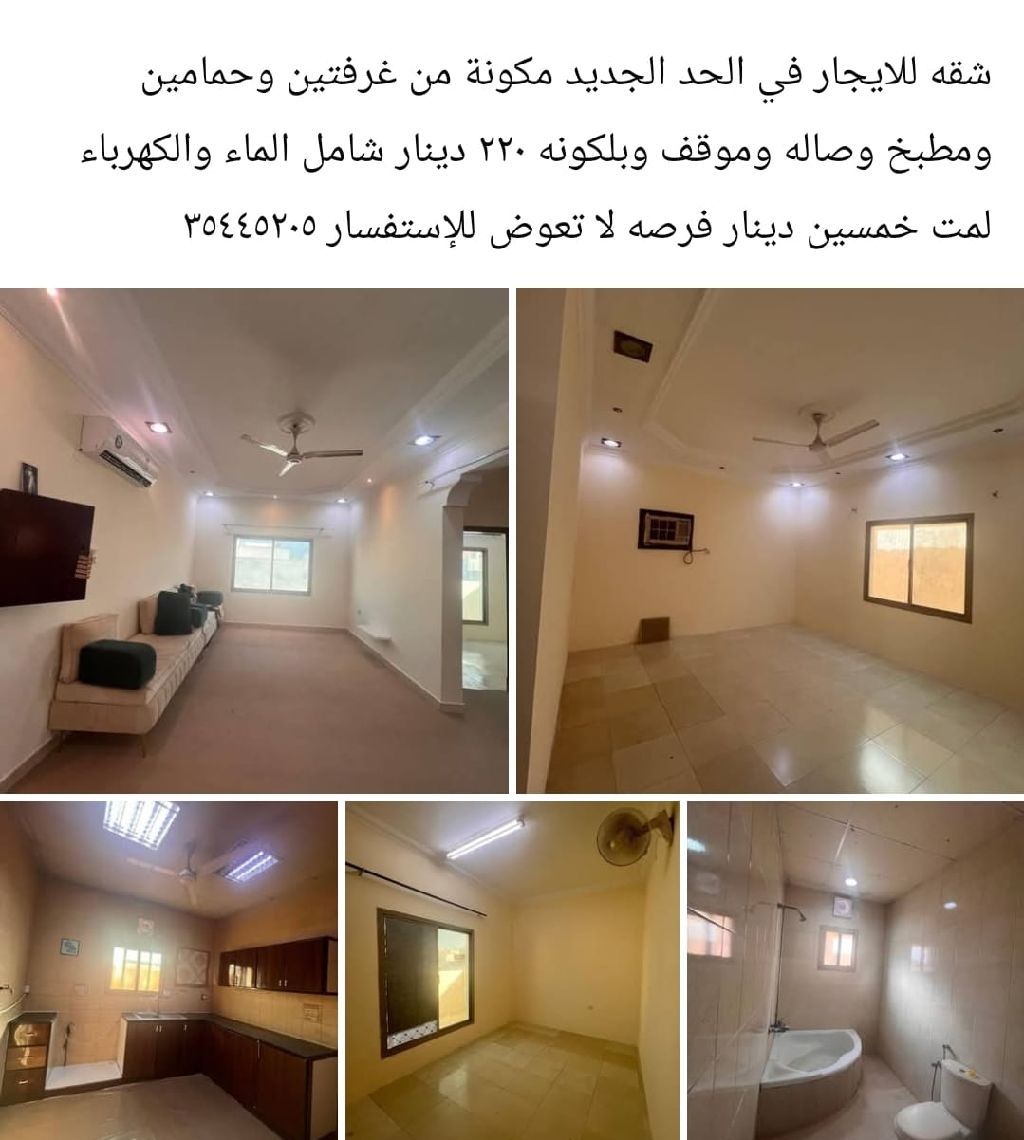 شقة للإيجار في الحد الجديد، مكونة من غرفتين، حمامين، مطبخ، صالة، موقف سيارات، وبلكونه. الإيجار 220 دينار شامل الماء والكهرباء. يتطلب تأمين خمسين دينار. فرصة لا تعوض