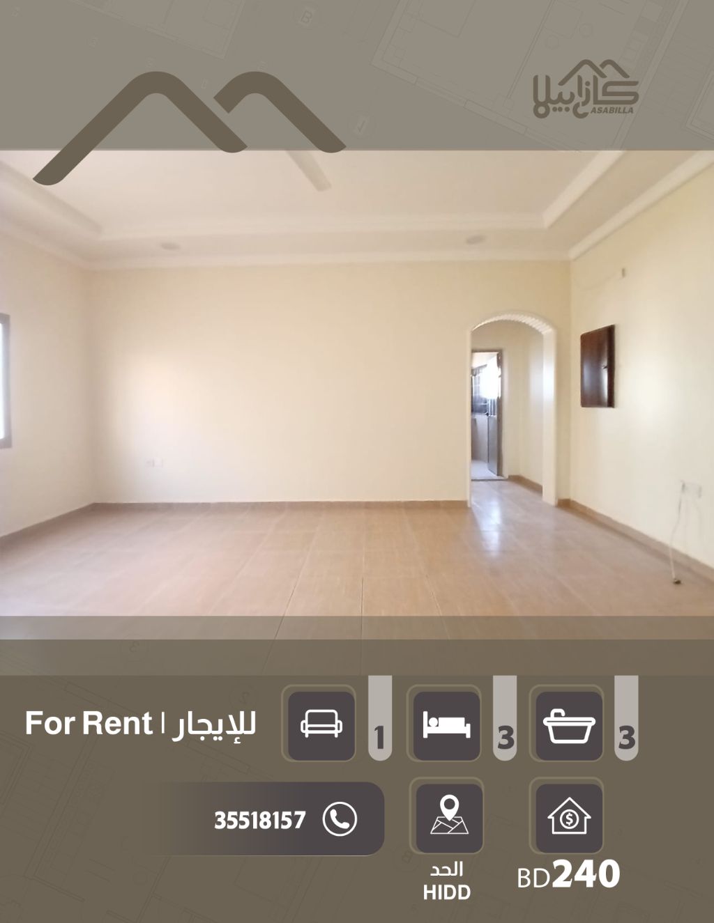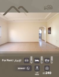 للإيجار: شقة واسعة في منطقة الحد، حي هادئ وراقٍ. تتكون من 3 غرف نوم، صالة عائلية كبيرة، مطبخ، 3 حمامات، وبلكونة. يوجد مصعد ومواقف سيارات. السعر 240 دينار، غير شامل الكهرباء. للاستفسار.