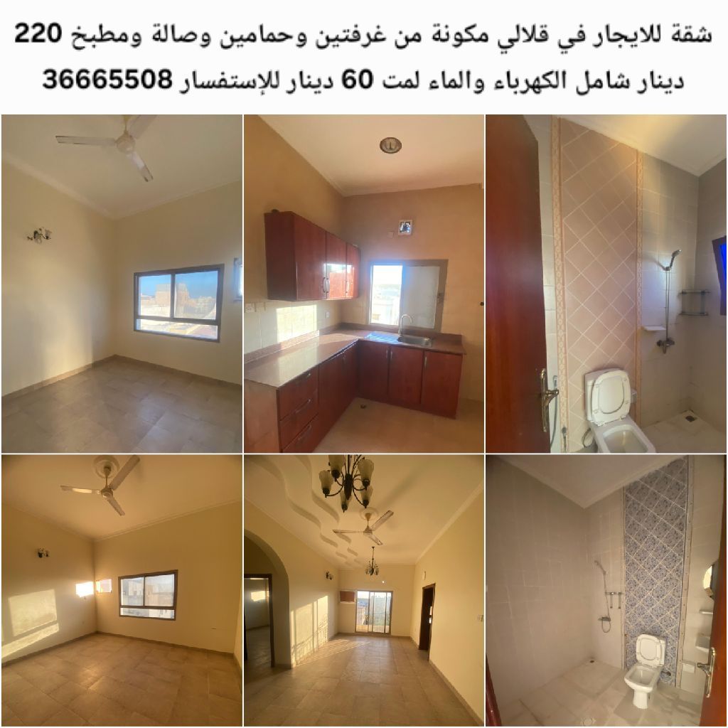 شقة للإيجار في قلالي مكونة من غرفتين وحمامين وصالة ومطبخ، بسعر 220 دينار شامل الكهرباء والماء بحد أقصى 60 دينار.