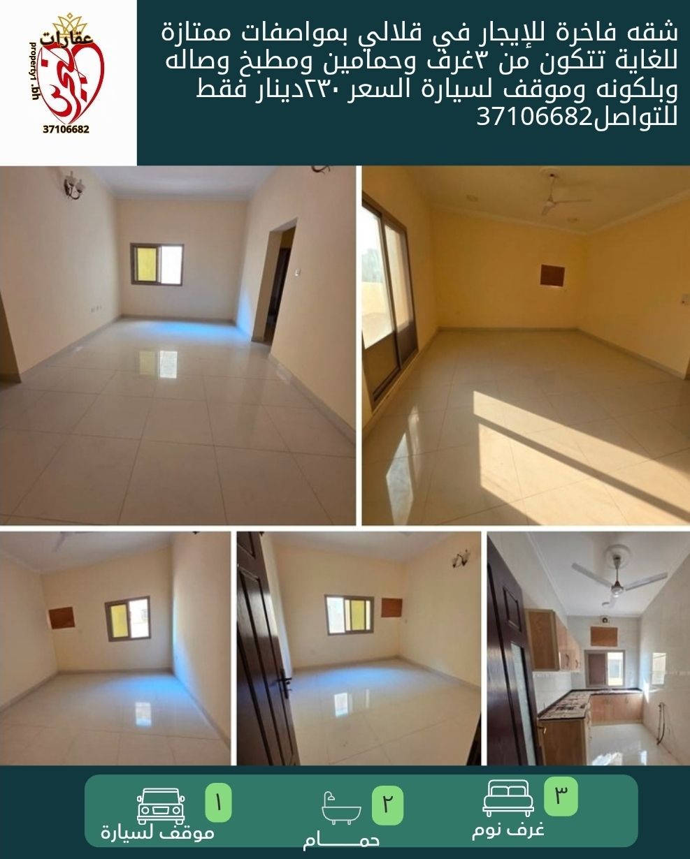 شقة فاخرة للإيجار في قلالي بمواصفات ممتازة للغاية، تتكون من 3 غرف وحمامين ومطبخ وصالة وبالكونة وموقف سيارة. السعر 230 دينار فقط. للتواصل