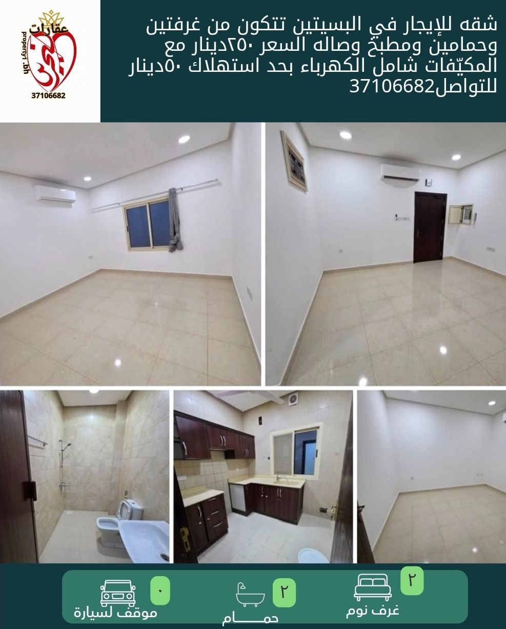 شقة للإيجار في البسيتين تتكون من غرفتين وحمامين ومطبخ وصالة. السعر 250 دينار مع المكيفات، شامل الكهرباء بحد استهلاك 50 دينار. للتواصل.