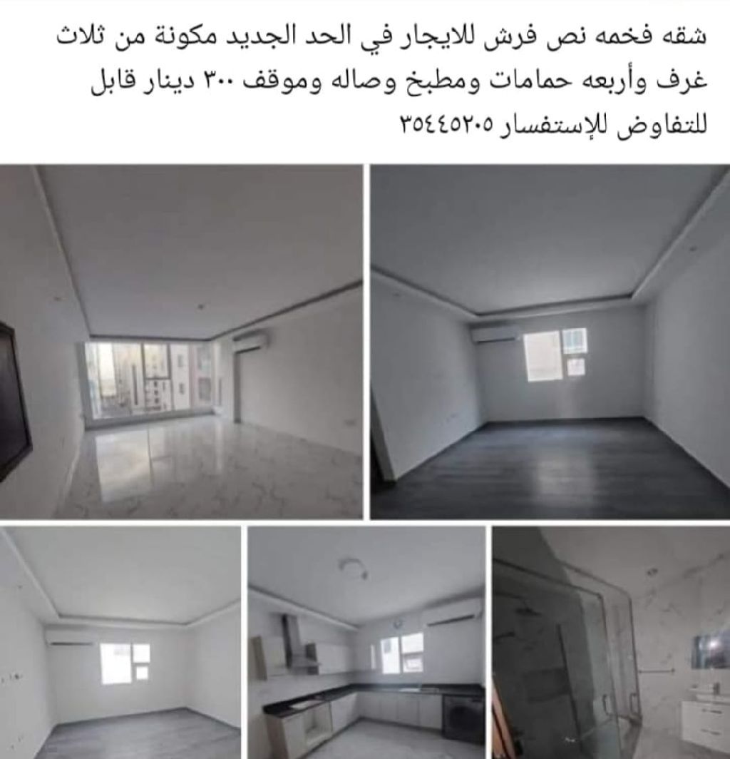 شقة فخمة نصف مفروشة للإيجار في الحد الجديد، تتكون من ثلاث غرف وأربعة حمامات ومطبخ وصالة وموقف سيارة بسعر 300 دينار قابل للتفاوض