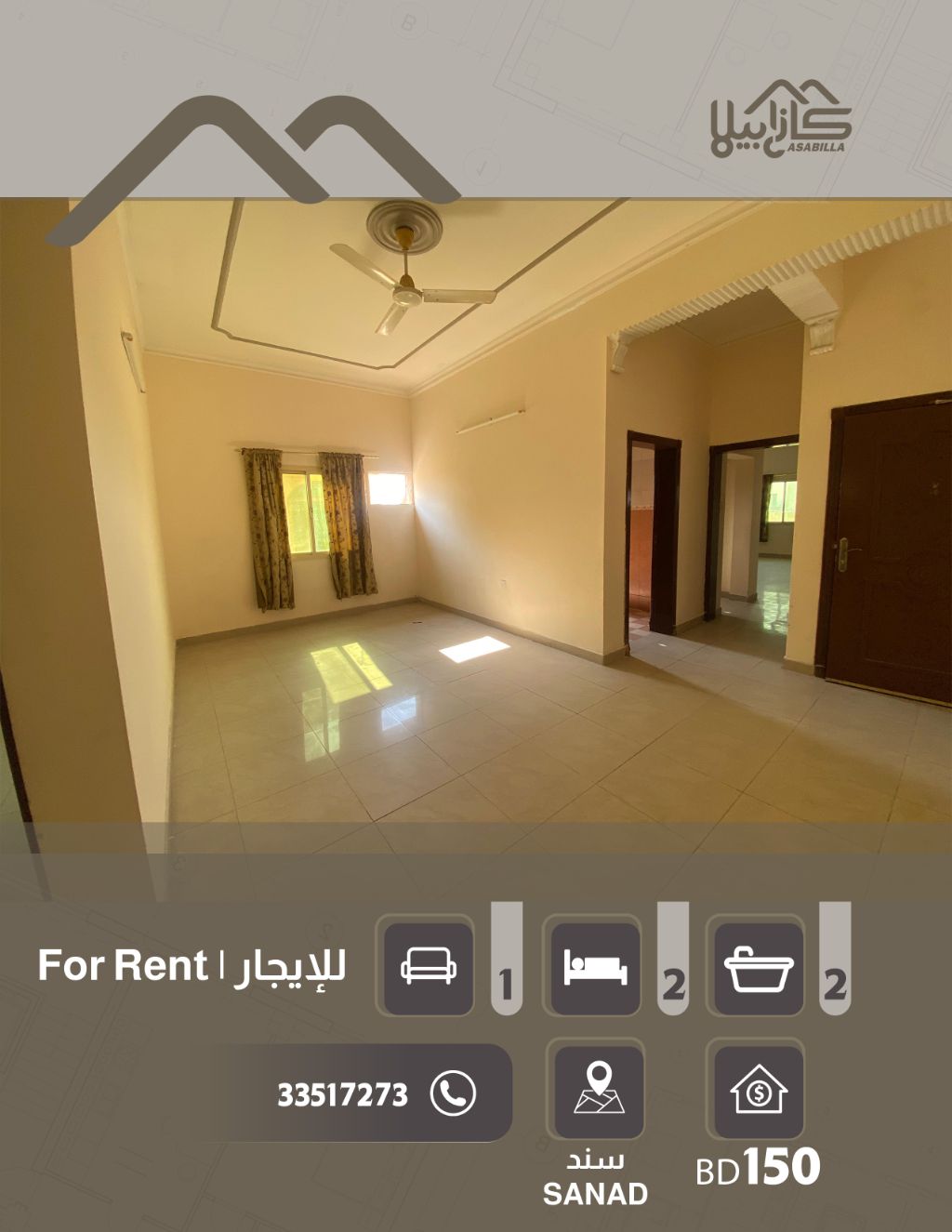 شقة للإيجار في سند، قريبة من إسكان سند. الخدمات تشمل مجمعات تجارية ومطاعم ومحلات تجارية. غرفتي نوم، واحدة ماستر، حمامين، صالة، مطبخ. الخدمات والمرافق تشمل موقف سيارة. منطقة هادئة جداً. الإيجار 150 بدون الكهرباء. للتواصل.
