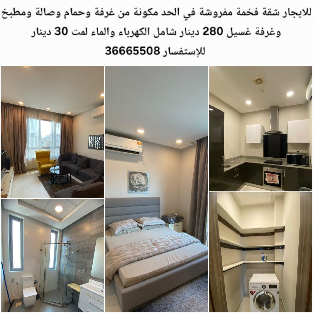 للإيجار شقة فخمة مفروشة في الحد، مكونة من غرفة نوم واحدة، حمام واحد، صالة، مطبخ، وغرفة غسيل. 280 دينار شامل الكهرباء والماء، حد 30 دينار