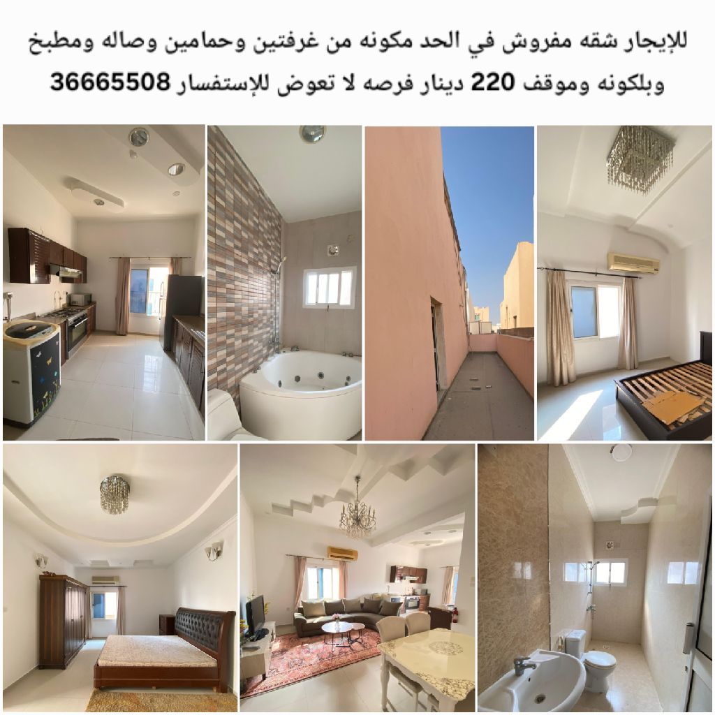 للإيجار شقة مفروشة في الحد مكونة من غرفتين وحمامين وصالة ومطبخ وبلكونة وموقف سيارات بسعر 220 دينار قابل للتفاوض. فرصة لا تعوض.