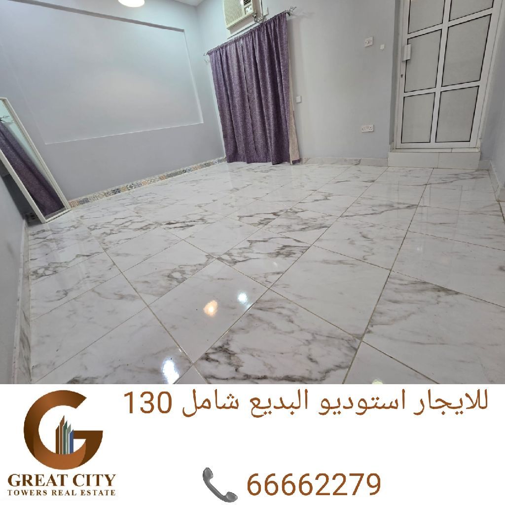 للإيجار استوديو شامل الكهرباء والمكيف في المقشع. يتكون الاستوديو من غرفة نوم، مطبخ، حمام، ومصعد كهربائي. الإيجار 130 ديناراً. للاستفسار، اتصل على 66662279. ملاحظة: لأكثر من شخص، يرتفع الإيجار إلى 140 ديناراً.