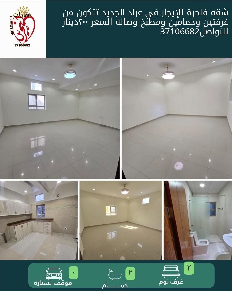 شقة فاخرة للإيجار في عراد الجديد، تتكون من غرفتين وحمامين ومطبخ وصالة. السعر: 200 دينار. للتواصل.