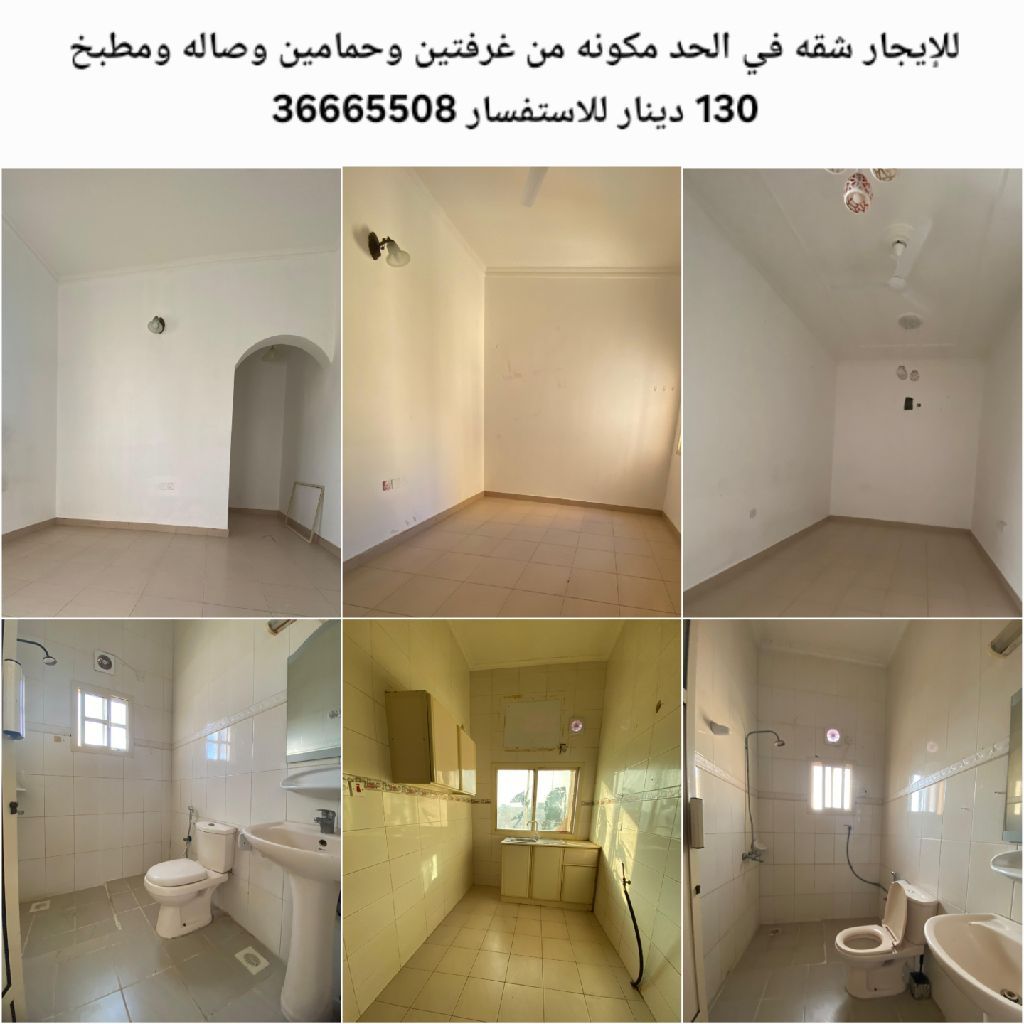 للإيجار شقة في الحد مكونة من غرفتين وحمامين وصالة ومطبخ بسعر 130 دينار