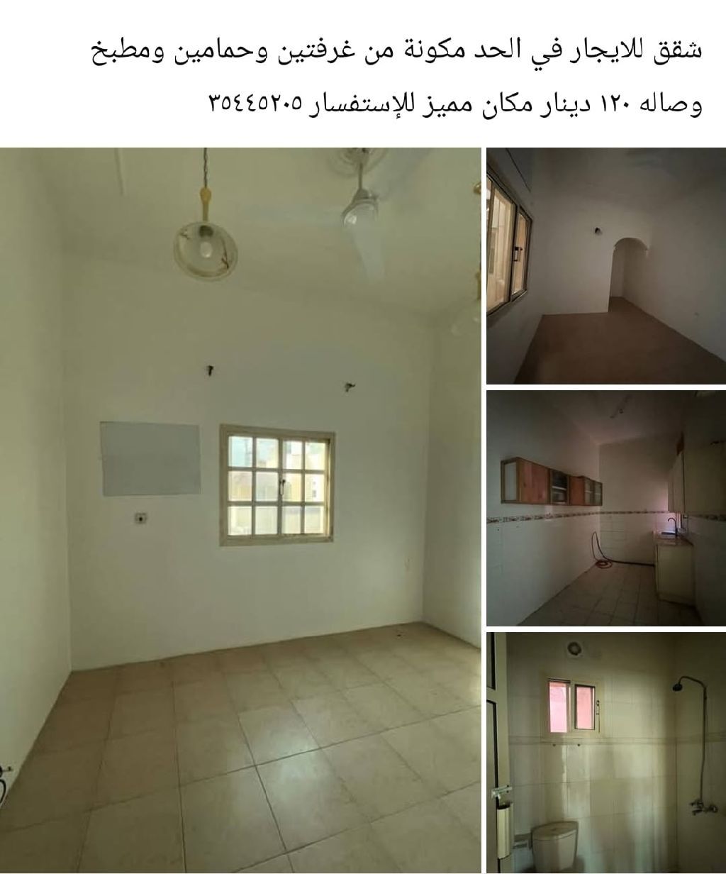 شقة للإيجار في الحد، مكونة من غرفتين وحمامين ومطبخ وصالة، بسعر 120 دينار. موقع مميز