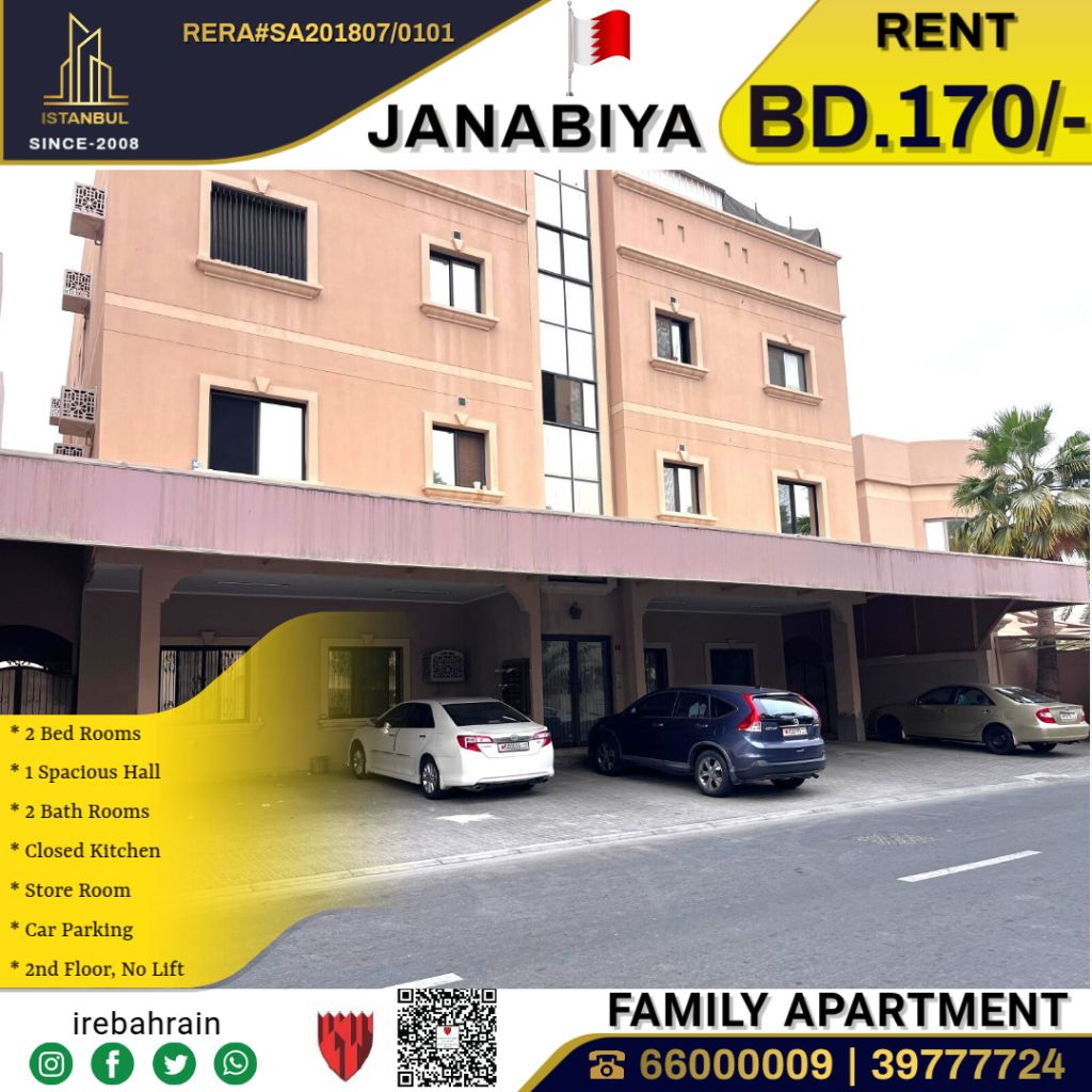 شقة عائلية للإيجار في الجنبية، بسعر 170 دينار بحريني. تقع هذه الشقة السكنية في الجنبية، بالقرب من مجمع ميركادو التجاري، جسر الملك فهد. تتكون من غرفتي نوم واسعتين، حمامين، صالة معيشة، مطبخ مغلق، مخزن منفصل، وغيرها. الشقة غير مفروشة في الطابق الثاني، بدون مصعد، ويوجد موقف سيارة. سعر الإيجار 170 دينار بحريني بدون رسوم الكهرباء والماء. قريبة من سار، جسر الملك فهد، الهملة، وغيرها