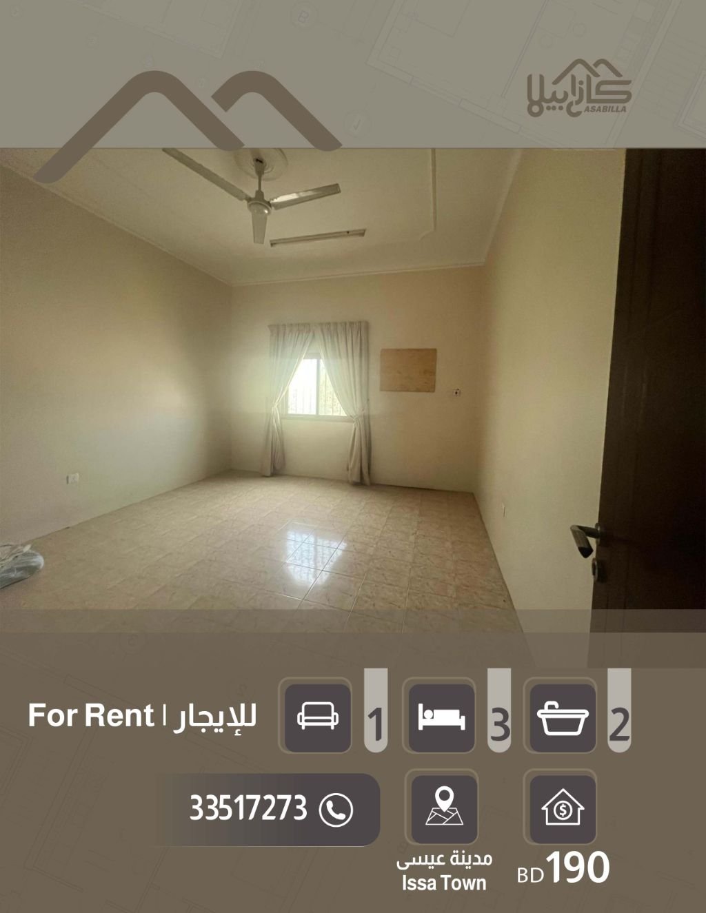 للإيجار: شقة في مدينة عيسى توبلي، شارع الخدمات، مناسبة للسكن العائلي. أولاً، تفاصيل الشقة: 3 غرف نوم، واحدة ماستر، حمامين، صالة، ومطبخ. ثانياً، المرافق والخدمات: قريبة من الخدمات، وتحتوي على بارك مظلل. الإيجار 190 دينار، غير شامل الكهرباء والماء. للتواصل.