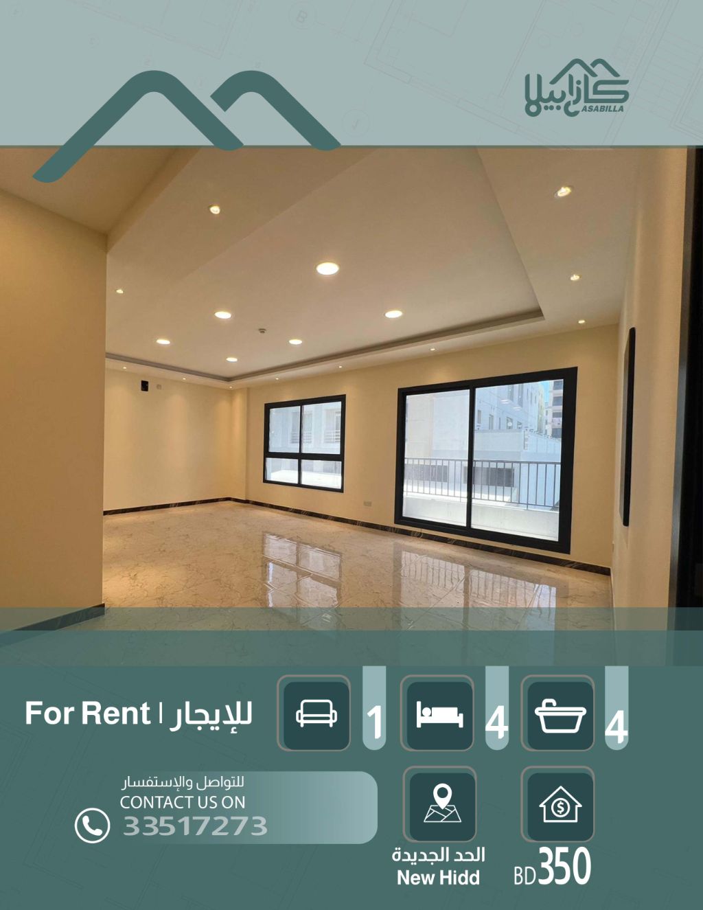 للإيجار: شقة في الحد الجديد مع مكيفات، تتكون من 4 غرف نوم، 4 حمامات، صالة، مطبخ، بلكونة، مصعد، وبارك خاص. سعر الإيجار 350 دينار بحريني شامل الكهرباء والماء، بدون صيانة. للتواصل للمزيد من التفاصيل.