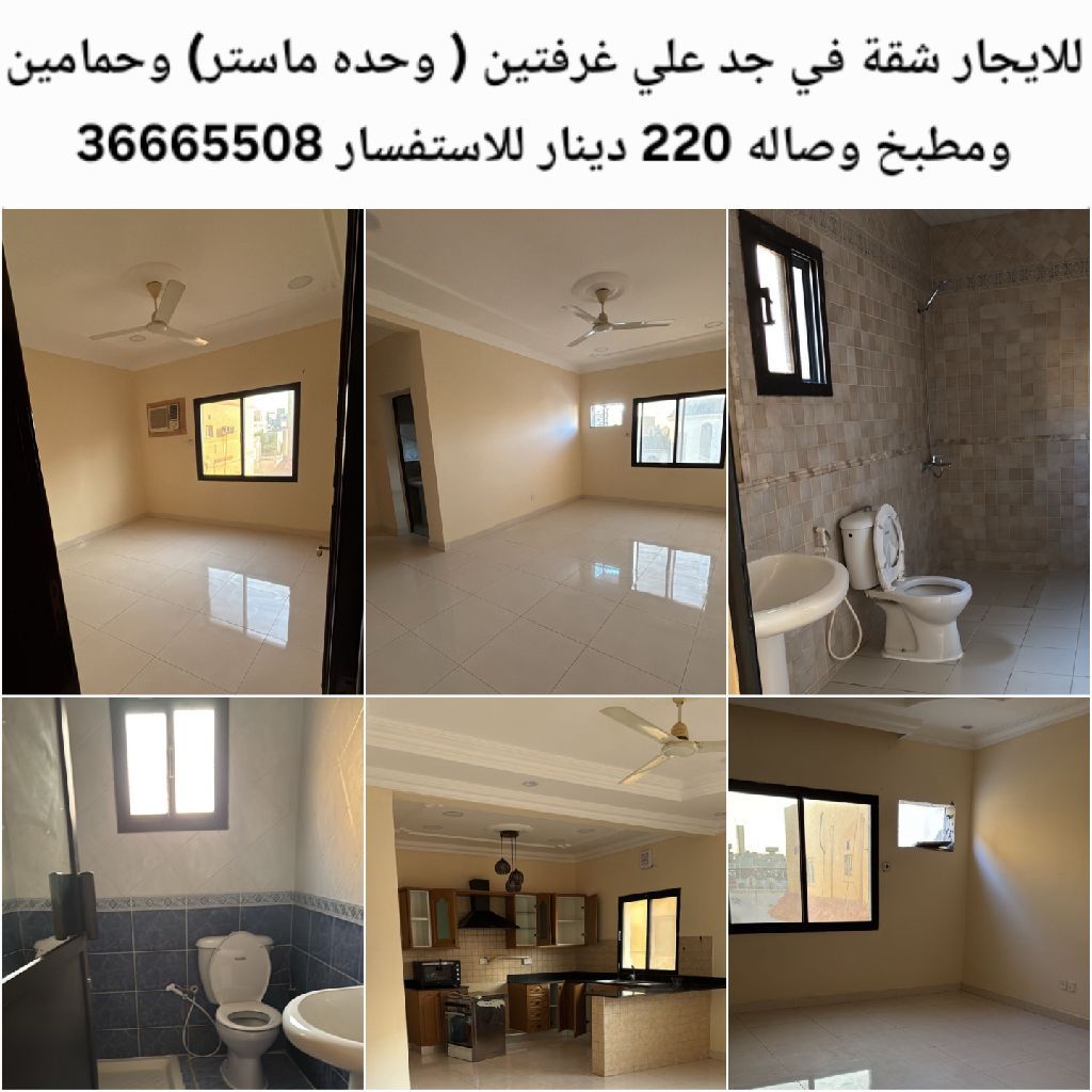 شقة للإيجار في جد علي مكونة من غرفتين وحدة ماستر وحمامين وصالة ومطبخ بسعر 220 دينار.