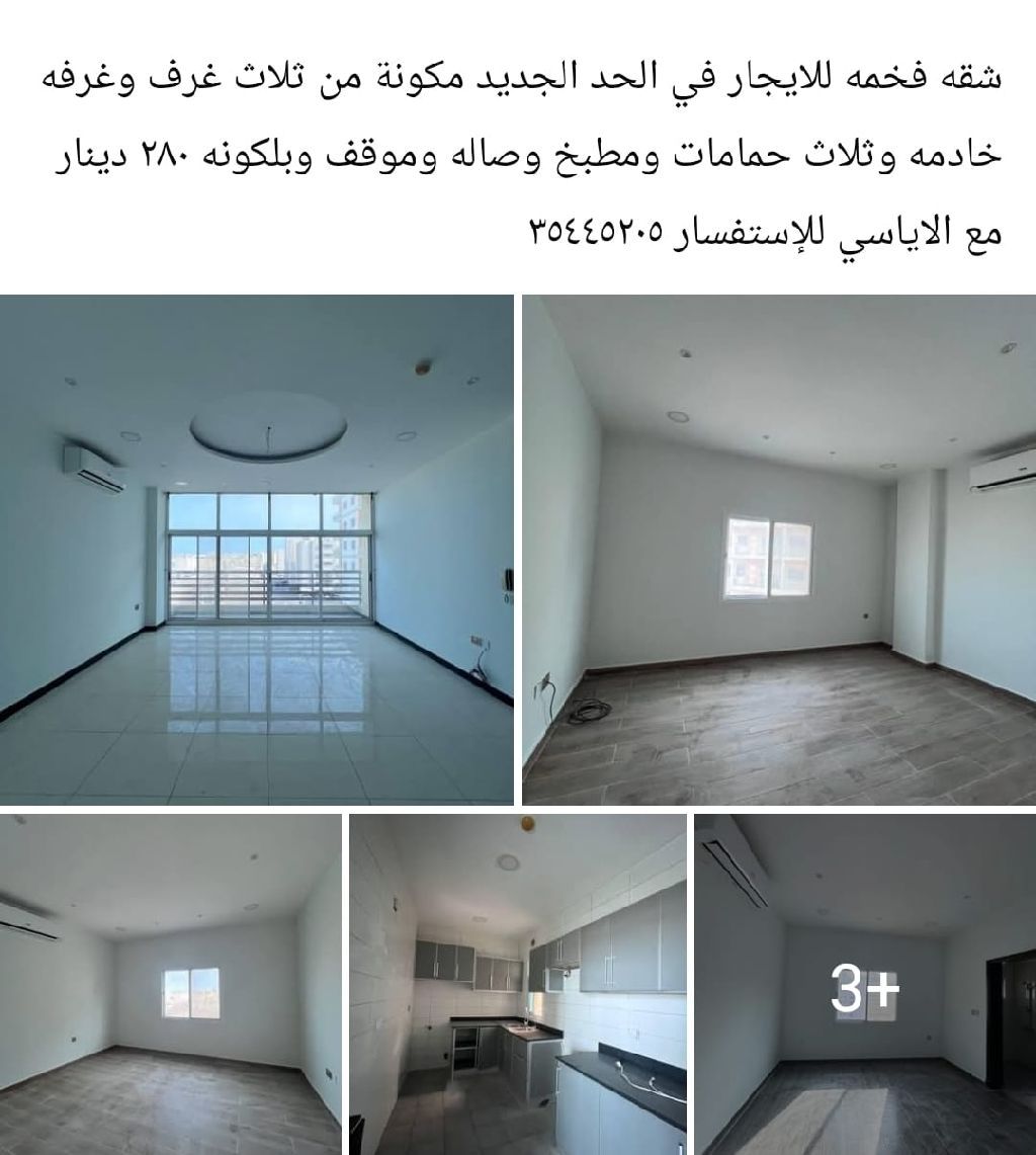 شقة فخمة للإيجار في الحد الجديد، مكونة من ثلاث غرف وغرفة خادمة وثلاث حمامات ومطبخ وصالة وموقف وبلكونة، بسعر 280 دينار مع المكيفات. فرصة لا تعوض.