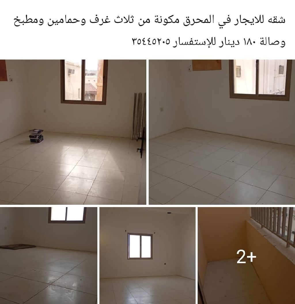 شقة للإيجار في المحرق مكونة من ثلاث غرف وحمامين ومطبخ وصالة بسعر 180 دينار. فرصة لا تعوض.
