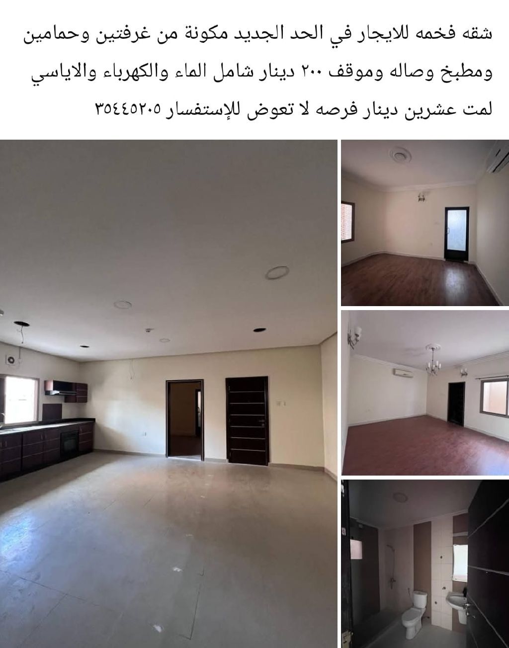 شقة فخمة للإيجار في الحد الجديد، مكونة من غرفتين وحمامين ومطبخ وصالة وموقف. 200 دينار شامل الماء والكهرباء والتكييف. الإيجار 20 دينار. فرصة لا تعوض.