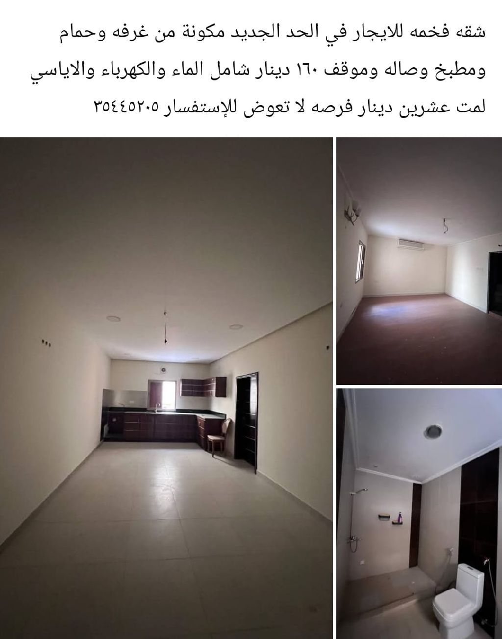 شقة فخمة للإيجار في الحد الجديد، مكونة من غرفة نوم واحدة ومطبخ وحمام وصالة وموقف للسيارات. الإيجار 160 دينار شامل الماء والكهرباء والتكييف. التأمين 20 دينار. فرصة لا تعوض.