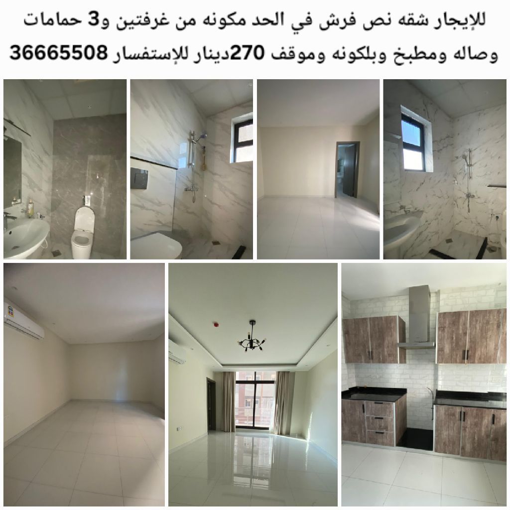 للإيجار شقة نصف مفروشة في الحد، مكونة من غرفتين وثلاثة حمامات وصالة ومطبخ وبلكونة وموقف سيارات بسعر 270 دينار.