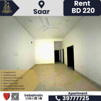 شقة عائلية للإيجار في سار، بسعر 220 دينار بحريني. الموقع: سار. شقة عائلية جديدة بثلاث غرف نوم وحمامين وصالة معيشة واسعة ومطبخ مغلق ومصعد متوفر. مناسبة للعائلات أو رجال الأعمال فقط. عداد كهرباء ومياه منفصل. سهولة الوصول إلى الجنبية، بالقرب من مول السوق، بالقرب من مول سار، وسهولة الوصول إلى طريق البديع السريع. الإيجار: 220 دينار بحريني شهرياً (بدون كهرباء ومياه).