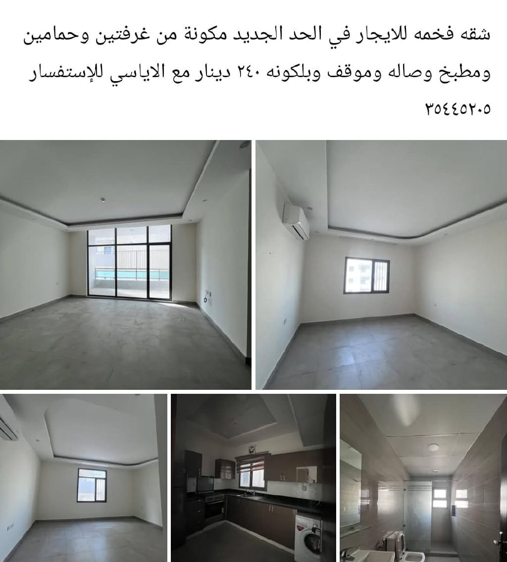 شقة فخمة للإيجار في الحد الجديد، مكونة من غرفتين وحمامين ومطبخ وصالة وموقف وبلكونة، بسعر 240 دينار مع المكيفات. فرصة لا تعوض.