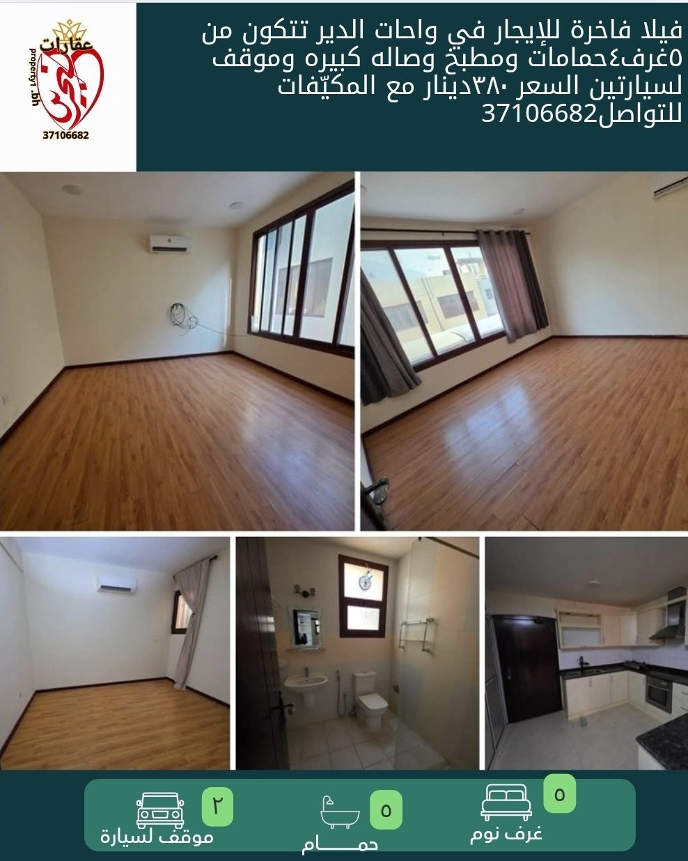 فيلا فاخرة للإيجار في واحات الدير تتكون من 5 غرف، 4 حمامات، مطبخ، صالة كبيرة، وموقف لسيارتين. السعر: 380 دينار مع المكيفات. للتواصل.