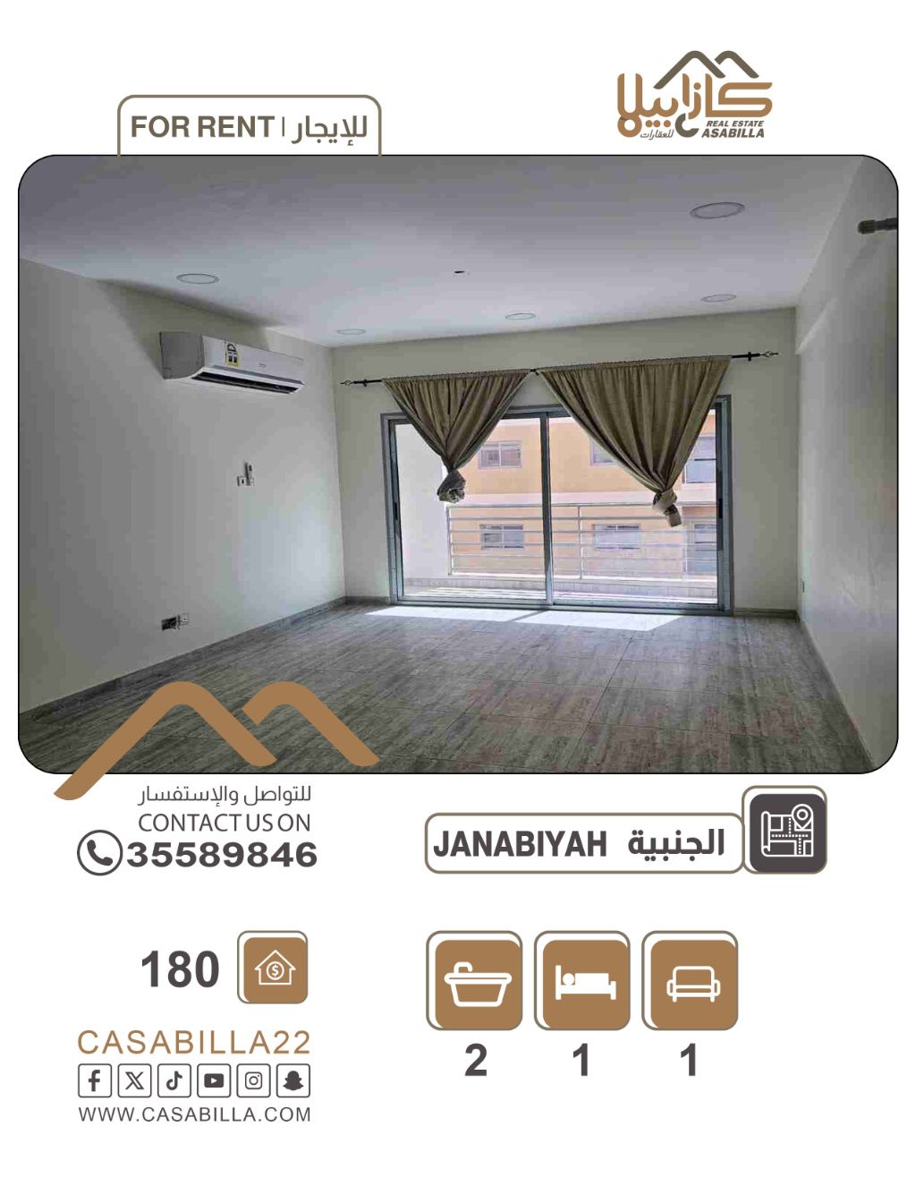 شقة شبه مفروشة للإيجار - الجنبية، غرفة نوم واحدة، مثالية للأفراد أو الأزواج. مطبخ مجهز + أجهزة منزلية أساسية، حمامان. منطقة سكنية هادئة مع سهولة الوصول للطرق الرئيسية. الإيجار 180 دينار بحريني شهرياً، جاهزة للسكن الفوري. للتواصل والاستفسار.