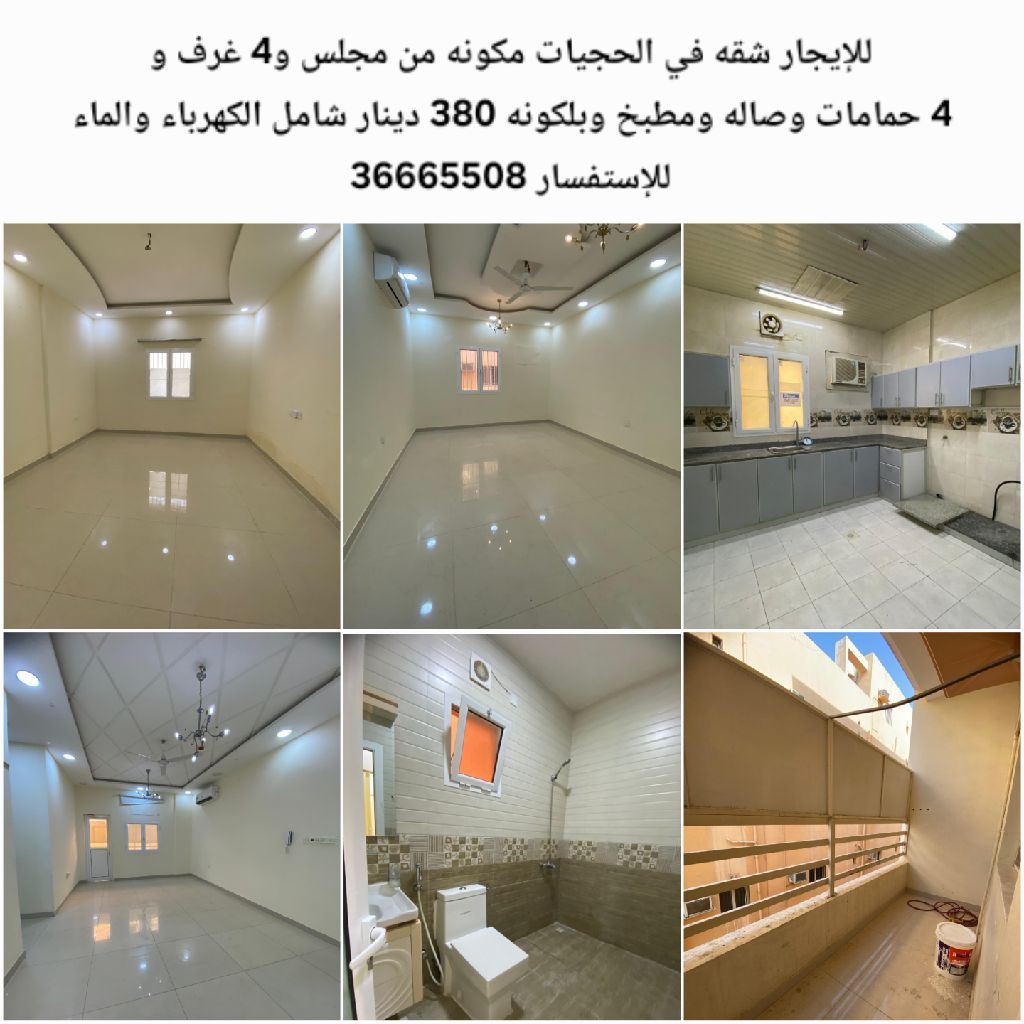 للإيجار شقة في الحجيات مكونة من مجلس و4 غرف و4 حمامات وصالة ومطبخ وبلكونة بسعر 380 دينار شامل الكهرباء والماء.