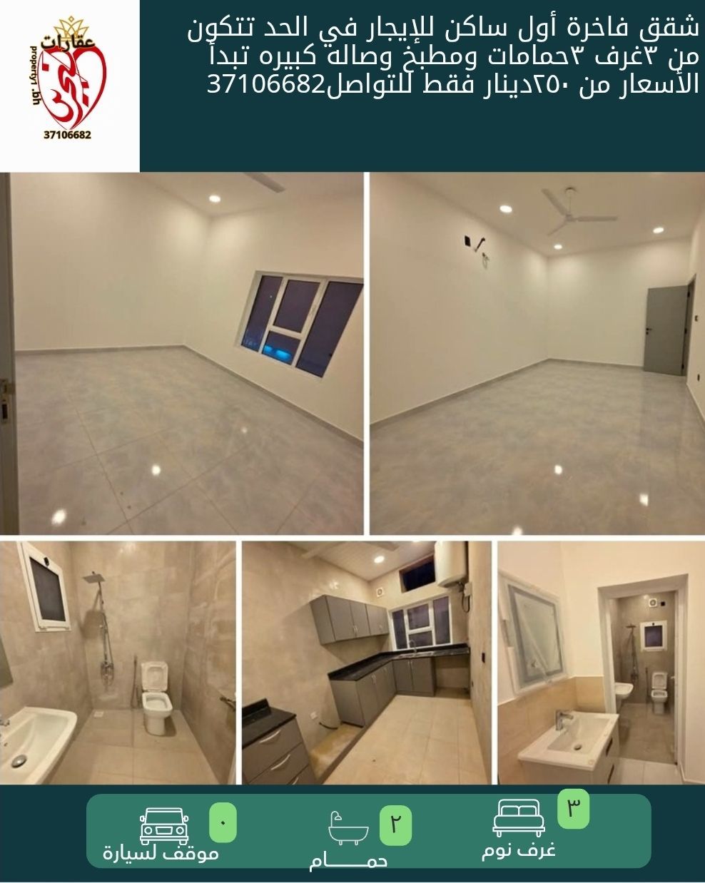 شقق فاخرة أول ساكن للإيجار في الحد. تتكون من 3 غرف، 3 حمامات، مطبخ، وصالة كبيرة. تبدأ الأسعار من 250 دينار فقط. للتواصل