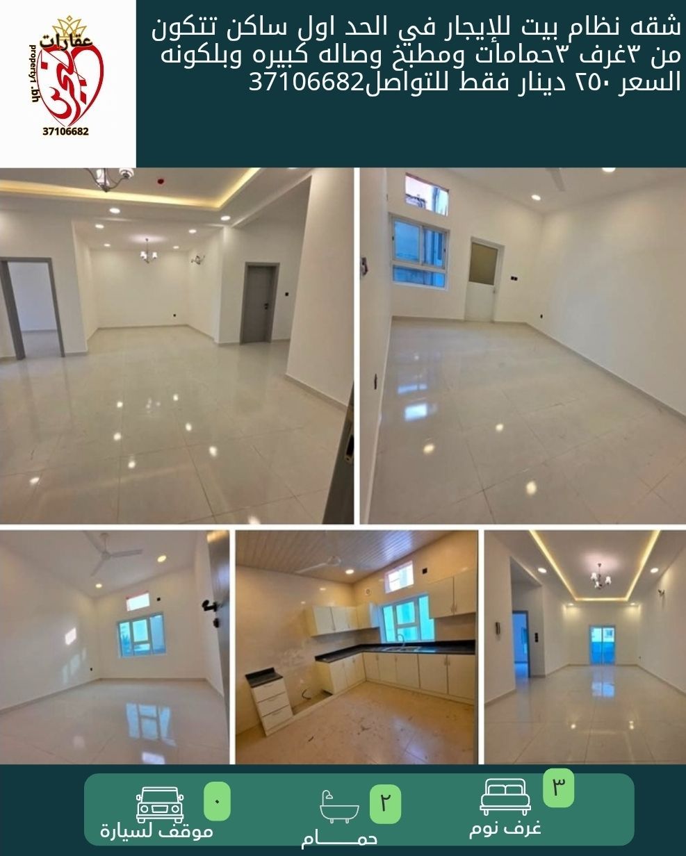 شقة للإيجار في منطقة الحد، أول ساكن. تتكون من 3 غرف نوم، 3 حمامات، مطبخ، صالة كبيرة، وبلكونه. السعر 250 دينار فقط. للتواصل